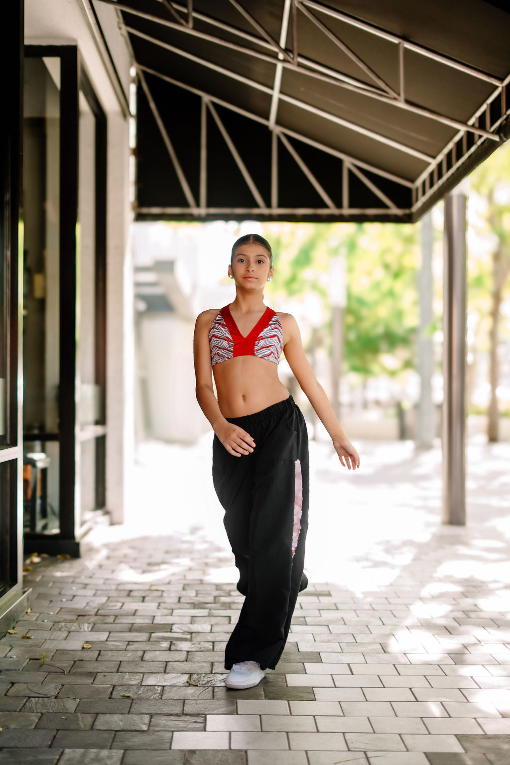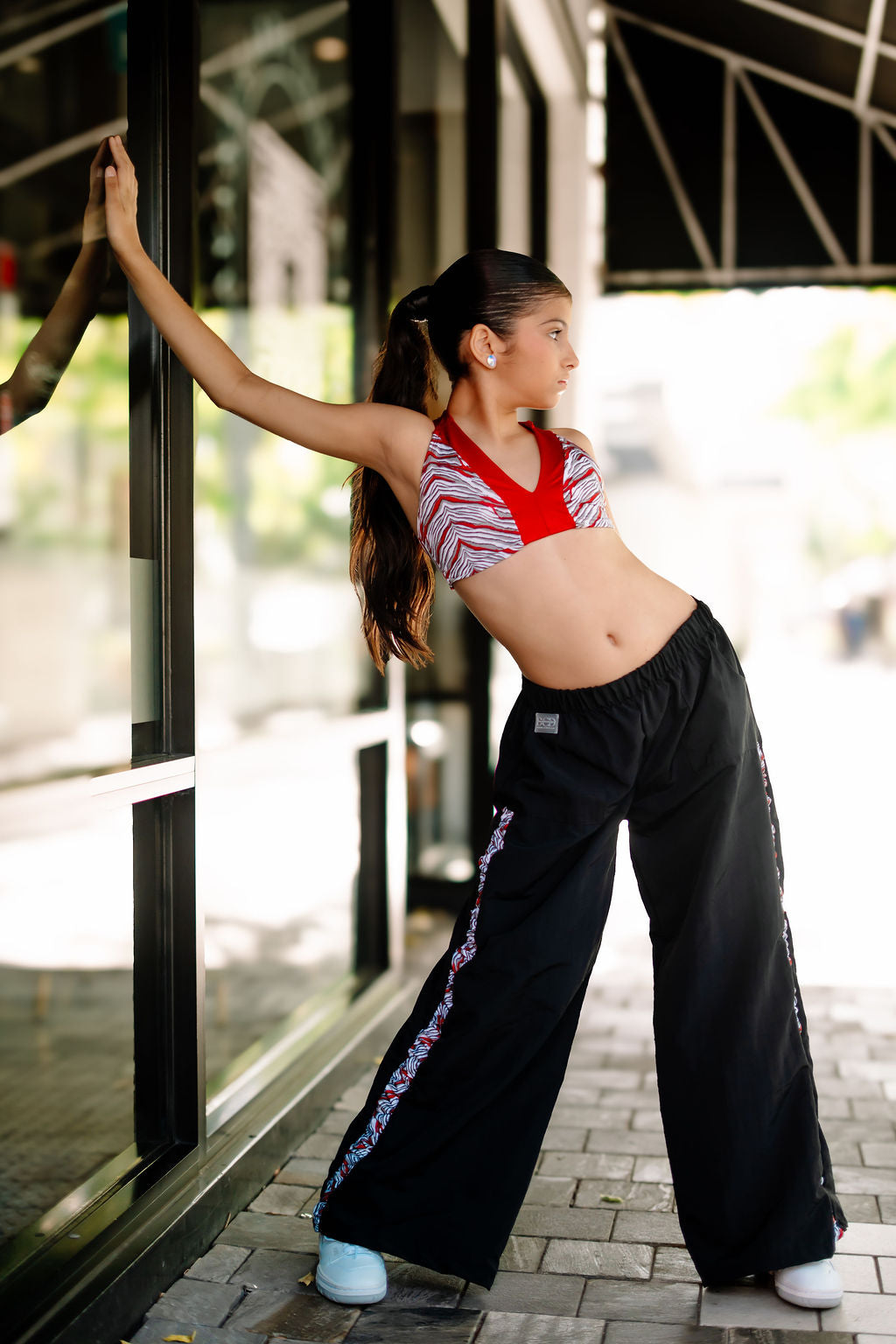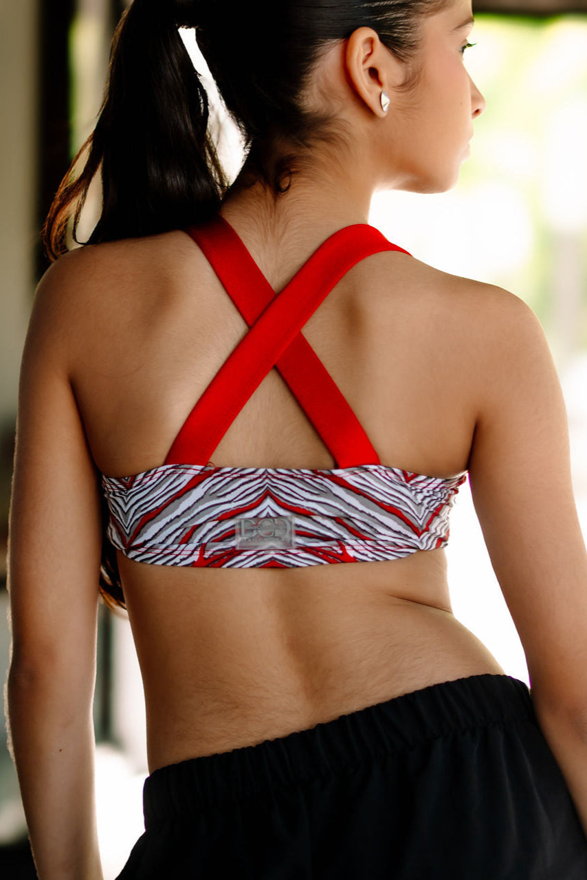 • Amanda top in a bold zebra print base with red accents.